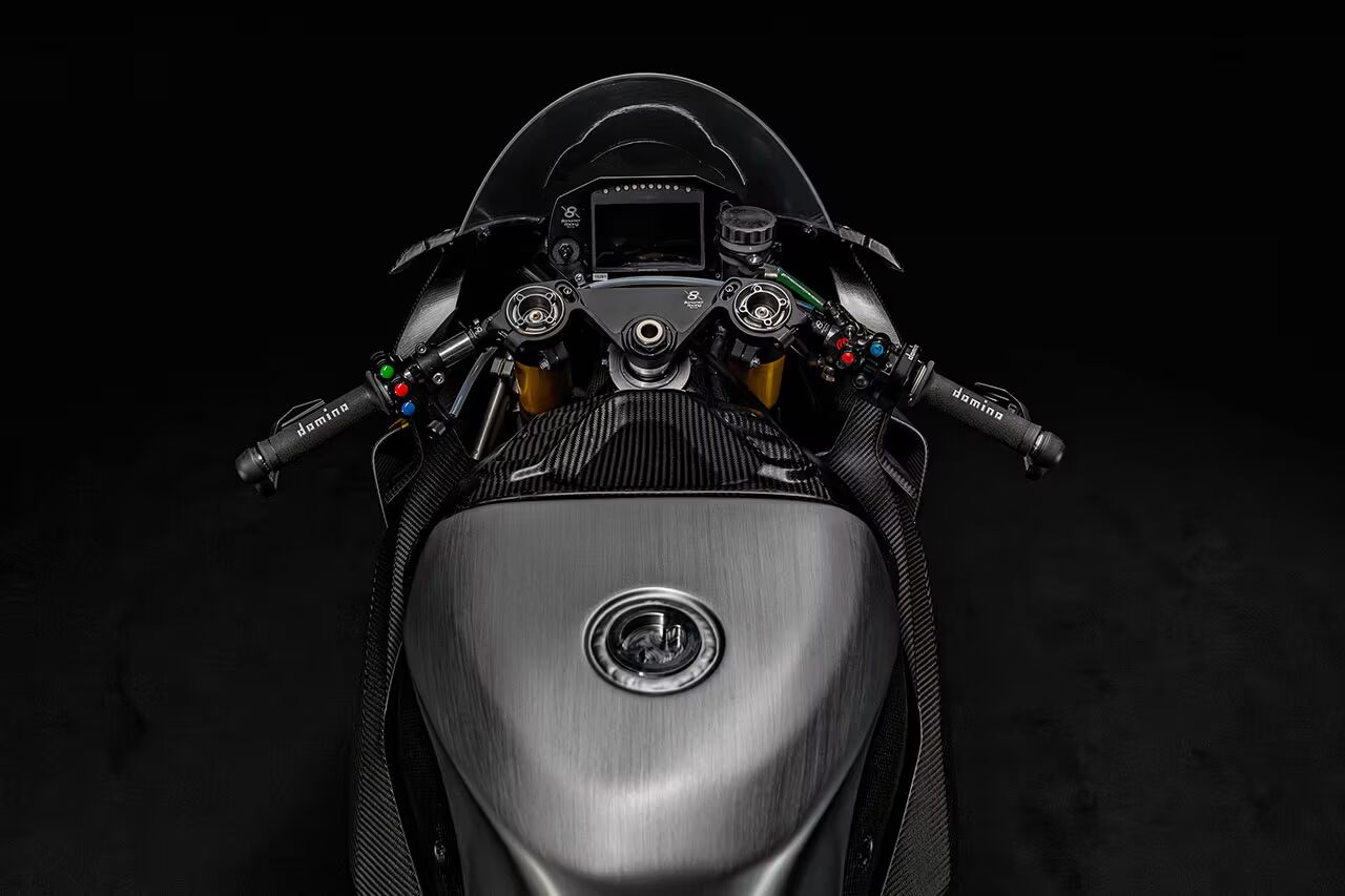 A szellőzőnyílásokkal ellátott idomzat, a formára szabott faridom, valamint az integrált leszorító szárnyak nemcsak vizuálisan ütősek, hanem funkcionálisan is kulcsszerepet játszanak a stabilitásban. Az egész gép úgy néz ki, mintha egyenesen egy MotoGP paddockból gördült volna elő.