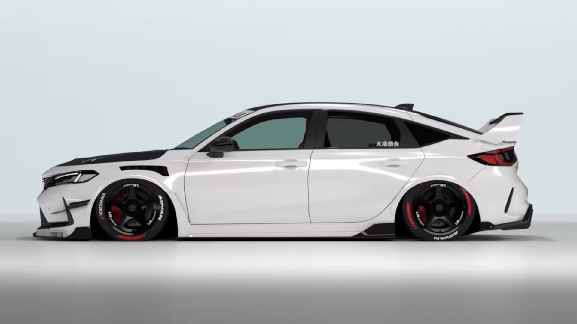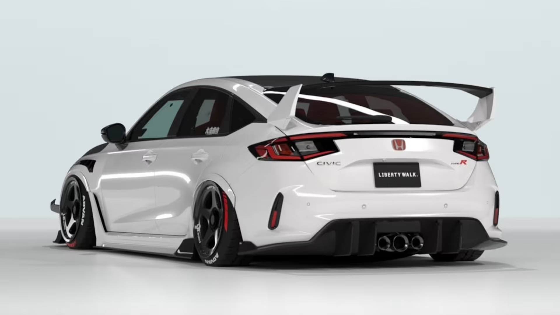A megjelenést egy szénszálas motorháztető és egy fekete tető egészíti ki, kontrasztot adva a színnek. A külső tükröket szénszálas kupakok fedik, míg hátul egy impozáns, az előző generációs FK8 Type R-re emlékeztető szárny és egy új diffúzor dominál, amely megtartja a három középső kipufogócsövet. A kerékjáratokban pedig – a Liberty Walk honlapja szerint – SS-5 öntött felnik kaptak helyet Yokohama gumikkal, bár megjelenésük inkább a forgalmazott Desmond Regamaster EVO kerekekre hasonlít.