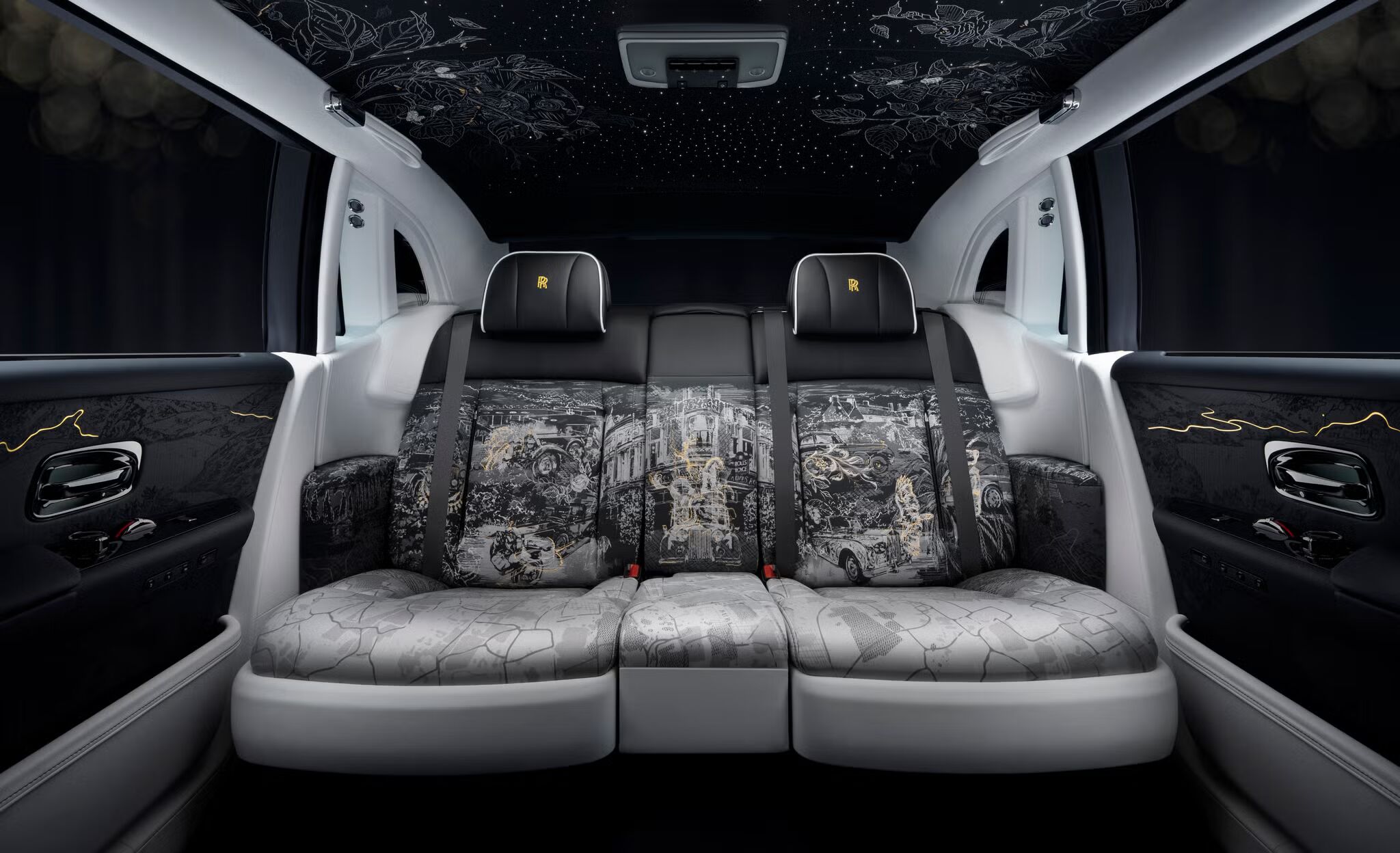A csomagtartó fedelén egy egyedi műtárgy, egy fém dombormű hívja fel a figyelmet a jubileumra. Ez a dombormű a Spirit of Ecstasy figurát ábrázolja, a Rolls-Royce szimbólumát, amelyet száz évvel ezelőtt védettek be. Ez a motívum nem csupán dekoráció, hanem egy állandó emlékeztető a márka gazdag hagyományaira és a kitartásra. A tulajdonos minden alkalommal, amikor a csomagtartót használja, szembe kerül ezzel a történelmi utalással.
